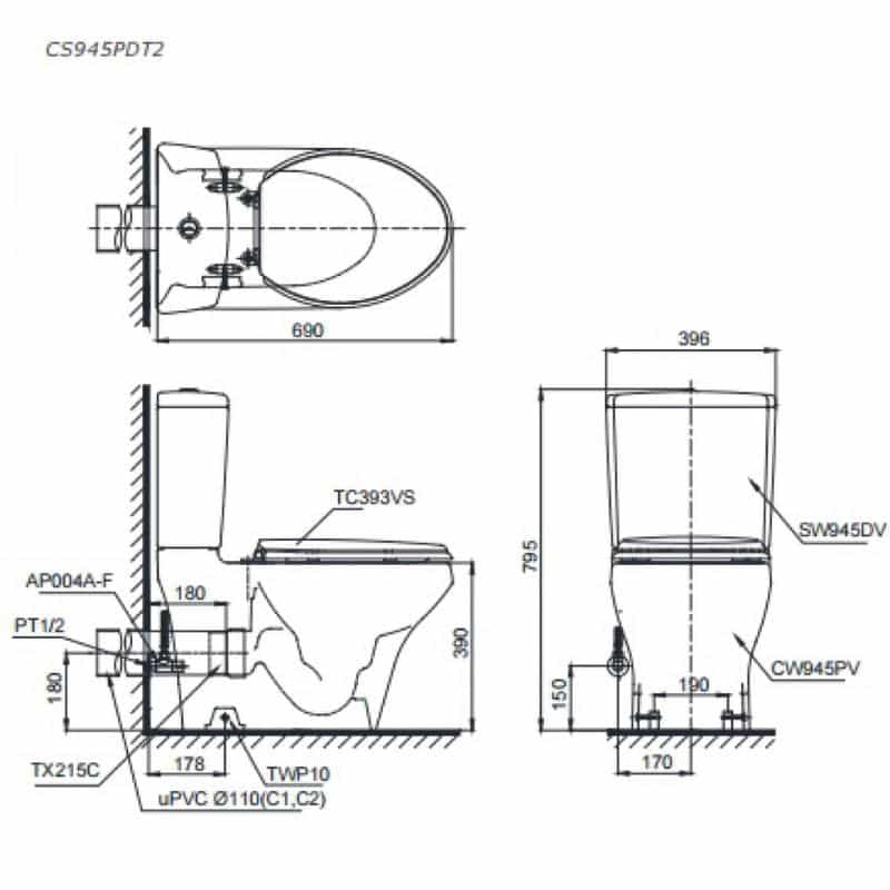 - Tên sản phẩm: Bồn cầu TOTO CS945PDT2 hai khối
